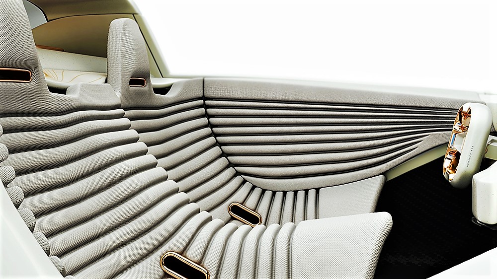 Images show a sparse-but-elegant interior, with the seats and door panels covered in a flowing ribbed material, as well as a gold-trimmed steering wheel. Renders of a racing variant are accompanied by text that reads “the original design of the P411, from mechanics to tires, is all about smooth acceleration and straight-line efficiency. However, it will allow for a little stress in curves, adding some real fun in the driven mode.” [Reference Here]