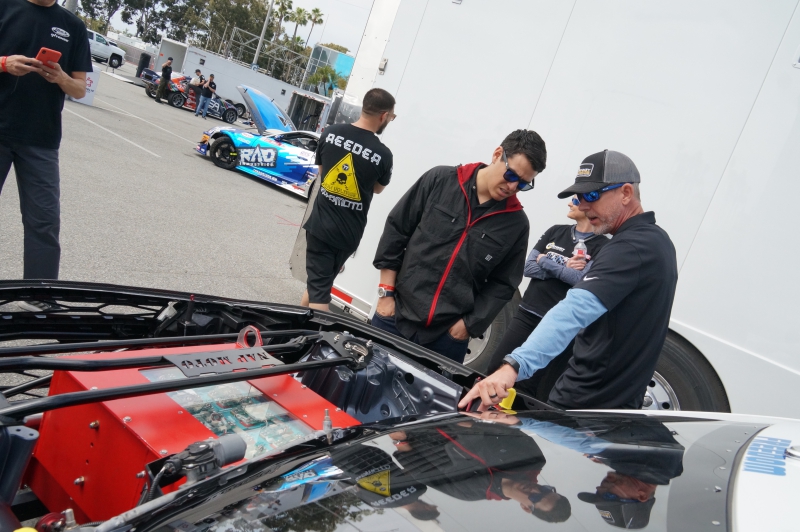 Joe Napoleon, Team owner and director of Napoleon Motorsports, describes some of the fabricated features in the converted engine to battery compartment during the Acura Grand Prix Of Long Beach Media Day. The weight and displacement of the batteries are fabricated to emulate the center of gravity and weight of a V-8 engine. Image Credit: Edmund Jenks (2019)