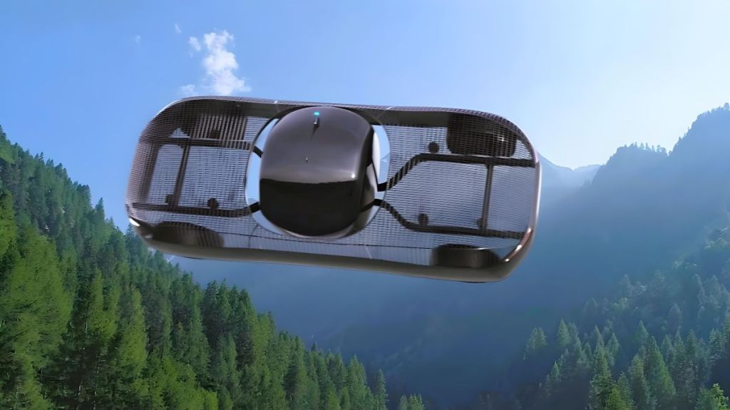 ALEF flying car in full motion flight after vertical lift-off from a driving surface. No airports required with an electric-powered platform that drives like a car and flies like an Osprey aircraft. Image Credit: Alef Aeronautics (2024)