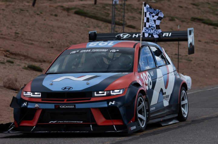 Three Hyundai IONIQ 5 N vehicles compete in the challenging Pikes Peak climb, demonstrating...